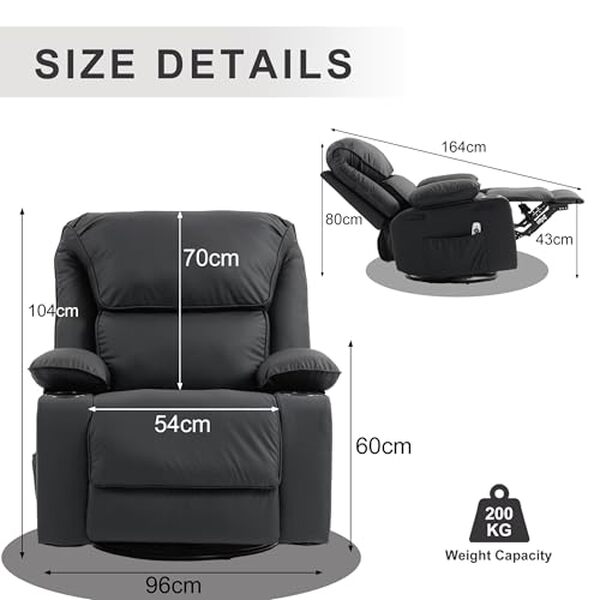 FONCTION MASSAGE ET CHAUFFAGE: Le fauteuil inclinable électrique à fonction de massage par vibrations en 8 points cible 4 zones (taille, lombaires, cuisses, mollets) pour un massage relaxant. La fonction de chauffage lombaire chasse la fatigue. RELAXATION ULTIME: Ce fauteuil de salon est doté d'une extension des pieds et d'une inclinaison du dossier. Le dossier peut être réglé entre 110° et 150°, ce qui le rend idéal pour lire, regarder un film ou faire une sieste HAUTE QUALITÉ: Le canapé offre un soutien stable à différents angles et peut supporter jusqu'à 200KG, et nos fauteuils inclinables sont fabriqués en tissu chenille de haute qualité, qui est respirant, confortable et respectueux de la peau. CONCEPTION RÉFLÉCHIE: Doté d'une poche de rangement et de 2 porte-gobelets, gar 2 PAQUETS DE LIVRAISON: En raison des limites de poids imposées pour l'expédition, votre fauteuil inclinable sera livré en deux paquets. Si vous n'en recevez qu'une partie, ne vous inquiétez pas, l'autre partie est en cours d'acheminement.
